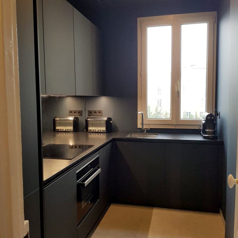Ce projet de cuisine nécessite la prise en compte de contraintes telle que la surface, la capacité de rangement et l’optimisation de l’espace pour rendre l’ensemble fonctionnel. Le résultat est celui de la sobriété associé à des astuces pour agrandir l’espace visuellement.